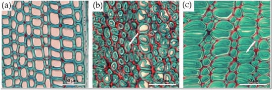 Transverse sections of three types of tropical tension wood stained with Safranin O/Fast Green [38] (arrows indicate the gelatinous layers): (a) Fiber cells of Virola michelii without gelatinous layers, which are similar to normal fiber cells; (b) gelatinous fibers of Inga alba, whose gelatinous layers’ thicknesses are similar to that of their adjacent layers; (c) gelatinous fibers of Sextonia rubra with thick gelatinous layers and negligible cavities.