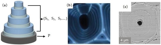 (a) Schematic diagram of tension wood fiber wall with multiple layers consisting of alternating broad and narrow layers; (b) Laetia procera tension wood fiber structure [46]; (c) Phyllostachys pubescens fiber structure. P: primary wall; S: secondary wall.