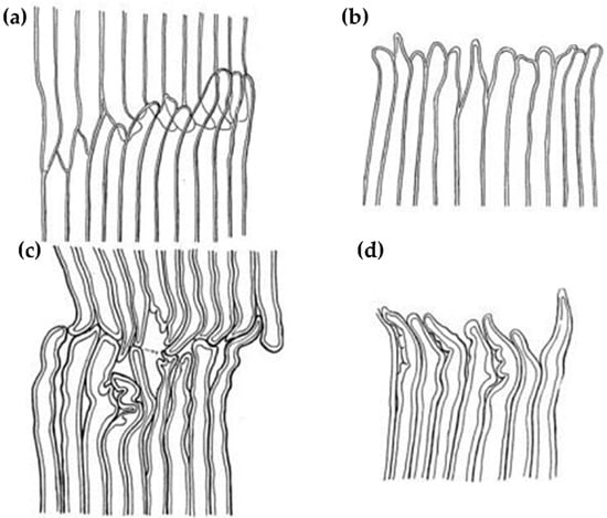Generally, the reaction wood in coniferous trees is located on the lower side of an inclined trunk, and it experiences significant compressive stress; such wood is called compression wood (Figure 1b) [9,12]. However, Zajączkowska et al. found that compression wood does not always form on the same side of the trunk in their study of Norway spruce. Although compression wood initially forms in the lower side of the trunk, it sometimes appears on the upper side or the lateral side of the trunk over time [49]. The main difference between compression wood and normal wood lies in the structural differences in their tracheids [50]. In their longitudinal section, the shape of normal tracheids is usually very straight, but the tracheids in typical compression wood are noticeably shorter than those in normal wood [51,52], and their two ends form a cross-twisted shape, which is usually flat or has L-shaped needle tips [53] (Figure 6). In their transverse section, compression wood tracheids have circular or elliptical contours, and their inner walls are embedded with spiral cracks that penetrate deeply into the cell wall layer, with there being a large number of intercellular spaces between the tracheids [54,55,56] (Figure 7b), which are features that obviously contrast with the quadrilateral or hexagonal shape of normal wood tracheids (corresponding wood) [57] (Figure 7a). In addition, compared with normal wood, the diameter of compression wood tracheids is slightly smaller, but the thickness of their cell wall is significantly increased, leading to a corresponding decrease in the diameter of their lumen [58]. Liu et al. [59] studied the anatomical characteristics of compression wood under different inclination angles by conducting experiments on the tilted growth of Pinus taeda L.’s trunk. They found that as the inclination angle of the trunk increased, the intercellular spaces in the compression wood gradually increased, and the spiral cracks became more numerous, wider, and deeper.