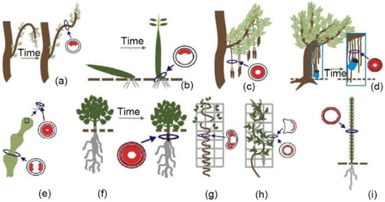 Distribution of reaction tissues (red areas) in various plants and organs [11]. (a) Branches of broad-leaved trees [68,69]; (b) stem of mangrove seedlings during gravitropic movement [70]; (c) pedicles of heavy fruits [63]; (d) Aerial roots [64]; (e) spines and cladode junction regions of Opuntia [71,72]; (f) roots and hypocotyls of geophytes [63,71]; (g,h) stems and tendrils of scandent and climbing plants [65,73]; (i) stems of fiber crops [64,72].