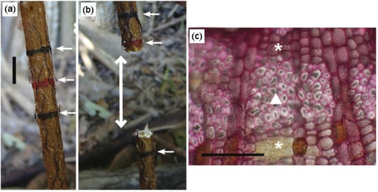 (a,b) Complete and severed grounded roots of Ficus altissima, with its cut surfaces separated by a distance of 3 cm (double-headed white arrow). Arrows indicate identifying marks [66]; (c) Secondary xylem of transected root * = parenchyma. ▲ = gelatinous fibers.