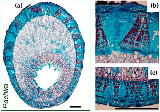 (a) Transverse sections of Pachira aquatica [74]; (b) upper side and (c) lower side of the tiled tree stem, including xylem and bark.