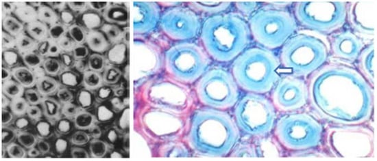 At the microscopic level, the formation of tension wood is usually accompanied by the formation of a gelatinous layer (G-layer) in the cell wall [18,28]. The gelatinous layer is a manifestation of variation in the cell wall structure in response to external stimuli, and it can occur at different stages of the formation of secondary walls of cells [22,28]. Panshin and de Zeeuw [29] summarized the relevant literature and found that tension wood with gelatinous fibers usually has three types of wall layer structures, as shown in Figure 3: (1) a G-layer in addition to the three layers of the normal, lignified, secondary cell wall (Figure 3a); (2) a G-layer that replaces the S3 layer, with the S1 and S2 layers remaining (Figure 3b); (3) a thick G-layer that replaces both the S2 and S3 layers, with the S1 layer remaining (Figure 3c). The G-layer is mainly or entirely composed of cellulose, has a small amount of hemicellulose or other polysaccharide components and a small amount of lignin [23,30], and contains a large number of pores [31,32]. The microfibrils of the G-layer are almost parallel to the fiber axis [17,33], while the adjacent wall layers have a larger microfibrillar angle [34,35,36]. In microscopic observations, the G-layer can be distinguished from other wall layers based on the physical and chemical reactions of different staining agents with the cell wall of gelatinous fibers, using double staining techniques [37]. A G-layer with a very low lignin content is stained green with Fast Green or blue with Astral Blue, while lignified cell walls are stained red with Safranin (Figure 4).