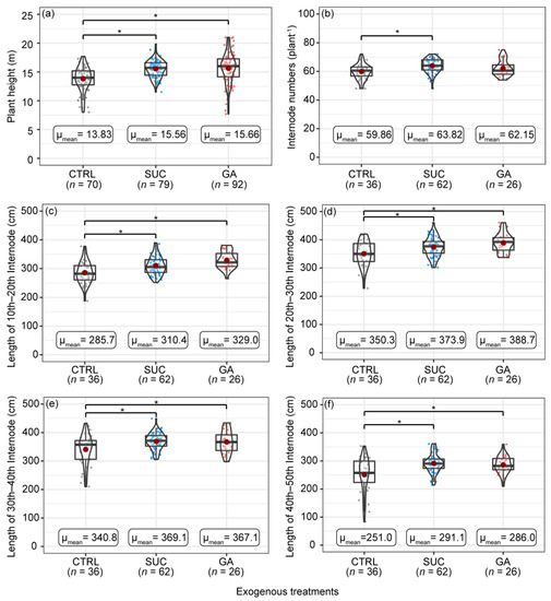 Comparisons of the plant height (a), internode number (b), lengths of the 10th–20th internodes (c), lengths of the 20th–30th internodes (d), lengths of the 30th–40th internodes (e), and lengths of the 40th–50th internodes (f) under different exogenous treatments. Box plots and violin plots show the data distribution of each variable. Points represent the measured values of each variable. Red points indicate mean values. The numbers in brackets represent sampling numbers. An asterisk means a significant difference according to the Bayesian GLMM.