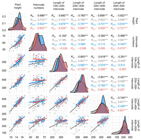 Correlations between the plant height; internode numbers; and lengths of the 10th–20th internodes, 20th–30th internodes, 30th–40th internodes, and 40th–50th internodes under different exogenous treatments. The different colors show each exogenous treatment. Numbers indicate Pearson correlation coefficients (* p < 0.05, ** p < 0.01, *** p < 0.001). Multidensity plots and scatterplots show the distributions of the variables.