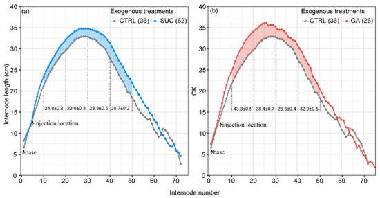 The internode lengths at different internodes under Suc (a) and GA (b) treatments compared with the CTRL. The points indicate the mean value of the internode length. The colored shapes indicate a significant difference in the length of every ten internodes between the Suc or GA treatment and the CTRL. The mean values and standard error of 10 internodes with a significant difference are shown between the lines. The numbers in brackets represent the sample sizes.