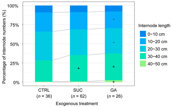 The percentages of internodes with different lengths under different exogenous treatments. The numbers in brackets represent the sample sizes. The symbols + or − mean a significant increase or significant decrease in the proportion of internodes compared with the CTRL, respectively.