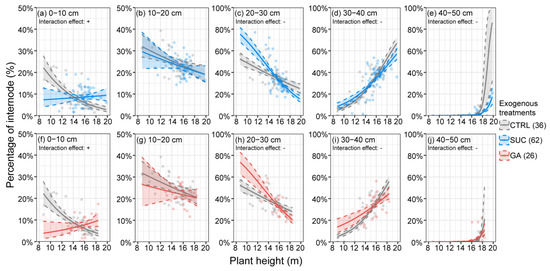 The effects of the interactions between the exogenous treatments and plant height on the percentage of internodes with different lengths ((a,f) 0−10 cm, (b,g) 10−20 cm, (c,h) 20−30 cm, (d,i) 30−40 cm, and (e,j) 40−50 cm). The points represent the percentage of internodes of each length at different plant heights. The shaded intervals within the dashed line show the 95% Bayesian credible intervals. The numbers in brackets represent the sample sizes. The symbols + or − mean a significant positive or negative interaction, respectively.