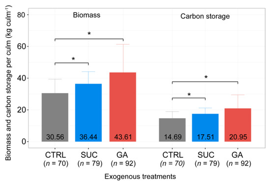 Comparison of the estimated biomass and carbon storage under different exogenous treatments. The numbers at the bottom of the bar graph represent the average values. The error bars show the 95% Bayesian credible intervals. The asterisk means a significant difference according to the Bayesian GLMM. The numbers in brackets represent the sample sizes.
