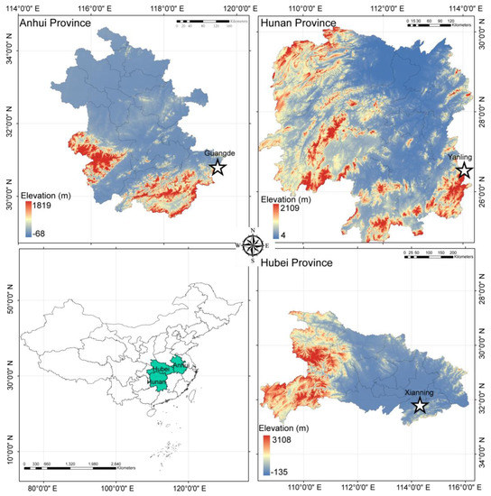 In the present study, all experimental subjects were selected from pure stands of P. edulis located in Guangde City of Anhui Province (119.384 E, 30.799 N), Yanling County of Hunan Province (114.033 E, 26.548 N), and Xianning City of Hubei Province (114.313 E, 29.815 N) in the south of China (Figure 8). The soils were predominantly yellow loam; the temperatures and precipitation (Table S7) were suitable for P. edulis growth as a major distribution area in China (annual average temperature: 15.6–19.5 °C, annual total precipitation: 1436.6–1876.2 mm) [127]. We randomly labeled 160 bamboo shoots at a height of close to 50 cm with a similar ground diameter and recorded the ground diameter of all shoots in each study site at the end of March 2021. We injected 50 mL of 20 μM Suc (Shanghai Yuanye Bio-Technology Co., Ltd., Shanghai, China; S11055) and 20 μM GA3 (Shanghai Yuanye Bio-Technology Co., Ltd., Shanghai, China; S28506) solutions into 60 shoots, and as a control, we injected 50 mL of pure water into another 60 shoots in each study site. We did not perform the exogenous treatment via spraying because the solution is usually sprayed on the leaves; however, bamboo grows very quickly during the rapid growth period and can reach heights that cannot be sprayed in a short time. The injection location was the fifth internode from the bottom. The injection was carried out every three days, five times in total in each study site from 28 March 2021 to 16 April 2021. Parenthetically, we found the suitable dose of Suc and GA to increase the plant height of bamboo shoots via pre-experiments from 2019 to 2020 in Guangde City, Anhui Province (119.384 E, 30.799 N). Virtually all bamboo shoots stopped their rapid growth by September. Hence, we measured the plant heights of the bamboo (n = 241) using the criterion RD 1000 (Laser Technology, USA) at the end of August 2021, except for other degraded bamboo shoots. Meanwhile, we felled 124 bamboo shoots (CTRL: 36; Suc: 62; GA: 26) and measured the internode length after labeling every internode. Owing to local laws and manpower constraints, we were not able to fell more bamboo plants.