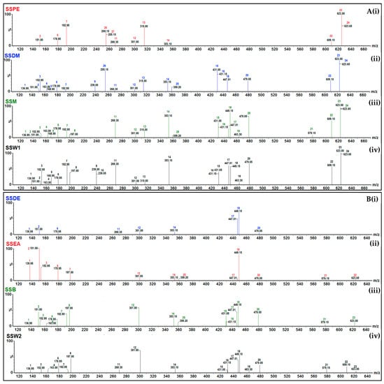 Selected ion recording (SIR) spectra: (A) (i) the petroleum (SSPE), (ii) dichloromethane (SSDM), (iii) methanolic (SSM), and (iv) initial aqueous (SSW1) isolated extracts and (B) the fractions of the methanolic extract (i) diethyl ether (SSDE), (ii) ethyl acetate, (iii) organic-phase butanol (SSB), and (iv) aqueous-phase butanol (SSW2) of S. scardica. Scanning (m/z; 120–650) was carried out utilizing collisions energies and m/z in the negative and positive electrospray ionization (ESI±) mode in accordance with the collision energy as presented in Table S1: 1—4-hydroxybenzoic acid; 2—vanillin; 3—protocatechuic acid; 4—p-coumaric acid; 5—gallic acid; 6—caffeic acid; 7—ferulic acid; 8—syringic acid; 9—2′-hydroxyflavanone; 10—7-hydroxyflavanone; 11—apigenin; 12—ellagic acid; 13—isorhamnetin; 14—chlorogenic acid; 15—kaempferol-3-O-rhamnoside; 16—apigenin-7-O-glucoside; 17—quercetin-3-O-rhamnoside; 18—luteolin-7-O-glucoside; 19—quercetin-3-O-galactoside; 20—myricetin-3-O-galactoside; 21—naringin; 22—quercetin-3-O-rutinoside; 23—verbascoside; 24—forsythoside; 25—rosmarinic acid; 26—4′-methoxyflavanone; 27—5-methoxyflavanone.