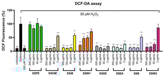 Finally, we assessed the antioxidant competence of the fractions in SH-SY5Y cells treated with hydrogen peroxide. We employed the DCF-DA assay, which measured the production of free radicals in cells [50]. The extracts were applied in a range of concentrations (2–200 µg/mL), and the results exhibited that they significantly lower the oxidative stress caused by hydrogen peroxide’s presence (Figure 2). This effect was more evident in concentrations ≥ 50 μg/mL. Below those levels, the protective action of the plant extracts started fading out. The only exception was SSPE, which did not show significant antioxidant activity. The EC50 values revealed strong antioxidant potential for SSEA, SSDE, SSB, SSM, and SSDM, while considerable activity was demonstrated for SSW2 and SSW1 (Table 3).