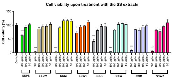 Determination of the maximum non-toxic concentrations of the different SS mixtures on SH-SY5Y cells. The error bars display the SEM from five separate tests. Note: * shows statistical significance of p < 0.05 and *** of p < 0.001 when compared to control untreated cells.