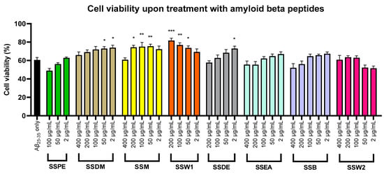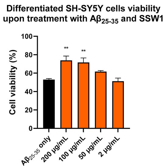 To confirm this finding, we tested whether SSW1, which showed the highest neuroprotective potential, could have the same effect in retinoic-acid-differentiated SH-SY5Y cells. Indeed, SSW1 showed a strong neuroprotective action against Aβ25–35 by partly restoring the viability of the cells treated with the neurotoxic peptides (Figure 5). In particular, while the Aβ25–35 treatment caused the viability of the cells to fall to ~53% compared with the untreated cells, the addition of 200 and 100 μg/mL SSW1 restored the cell viability to ~74% and ~72%, respectively. Treating cells with 50 μg/mL of SSW1 restored the cell viability to ~62% but was not statistically significant, while 2 μg/mL of SSW1 did not have any effect.