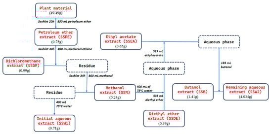 The plant material (fixed-weight 49.49 g) was exhaustively extracted into a Soxhlet extractor with the solvents petroleum ether (850 mL), dichloromethane (800 mL), and methanol (800 mL) consecutively (for 20 h, 30 h, and 34 h, respectively), and the three collected fractions (SSPE, SSDM, SSM) were concentrated under vacuum to the point of dryness. The aerial parts of Sideritis scardica were then extracted with 400 mL of 75 °C water and the fraction (SSW1) was evaporated to dryness under reduced pressure. The dry remainder of the methanolic fraction was dissolved in 400 mL of 75 °C water, filtrated, and partitioned using the following solvents: diethyl ether, ethyl acetate, and n-butanol (20-fold of 26.75 mL, 20-fold of 25.75 mL, and 9-fold of 15 mL, respectively). The organic layers of these solvents (SSDE, SSEA, and SSB respectively) and the remaining aqueous extract (SSW2) were evaporated to dryness. This procedure is graphically presented in Figure 6. Before use, the extracts were dissolved in DMSO or methanol (1 mg/mL), passed through a 0.22 μm filter (cellulose nitrate; Sartorium Stedim, Guttenberg, Germany), and maintained at −20 °C in the dark.