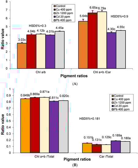 2.2. Evaluation of the Effects of Heavy Metal Exposure on the Free Proline and Assimilating Pigments Content