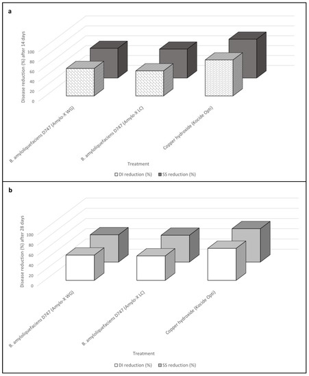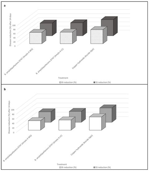 Reduction in disease incidence (DI) and symptoms severity (SS) according to Abbott’s indexes for Bacillus amyloliquefaciens strain D747 (Amylo-X® LC and Amylo-X® WG) and copper hydroxide (Kocide Opti®) foliar applications calculated over time, 14 (a) and 28 (b) days after the inoculation of Plenodomus tracheiphilus. Disease incidence (DI) and symptoms severity (SS) data are compared with each other.