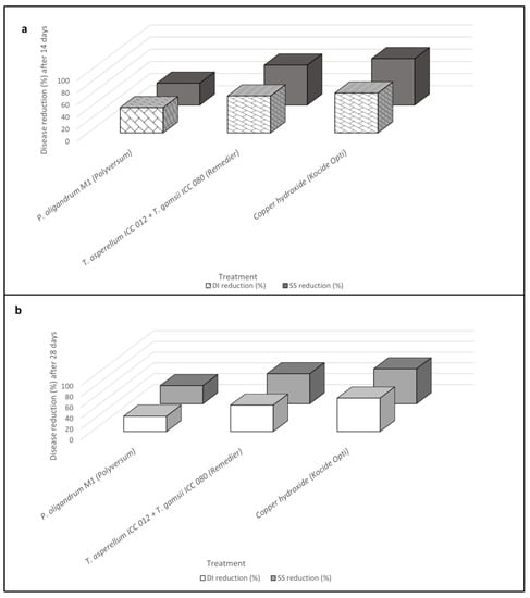 Reduction in disease incidence (DI) and symptoms severity (SS) according to Abbott’s indexes for Pythium oligandrum M1 (Polyversum®), Trichoderma asperellum ICC 012 + Trichoderma gamsii ICC 080 (Remedier®), and copper hydroxide (Kocide Opti®) applications calculated over time, 14 (a) and 28 (b) days after the inoculation of Plenodomus tracheiphilus. Disease incidence (DI) and severity symptoms (SS) data are compared with each other.