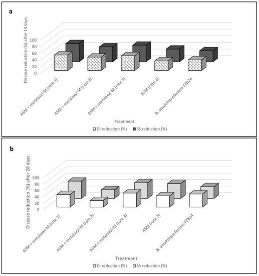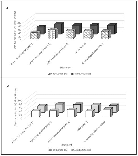 In this experiment, the detected DI reduction with acibenzolar-S-methyl (ASM) applications was 29% (Day 14) and 35% (Day 28), whereas SS reduction was 38% (Day 14) and 47% (Day 28) when compared with values obtained in the untreated controls over time. The mixture of ASM + metalaxyl-M at three rates determined a DI reduction ranging from 40% to 47% (Day 14) and from 20% to 44% (Day 28), whereas SS reductions ranged from 45% to 55% (Day 14) and from 27% to 54% (Day 28). BCA applications were as effective as ASM in controlling disease, with DI reductions of 32% (Day 14) and 41% (Day 28) whereas SS reduction was 33% (Day 14) and 36% (Day 28) (Table 9 and Figure 5). With regard to disease progression over time, the DI and SS data of ASM + metalaxyl-M applications increased from 2% to 50% after 28 days when compared to those detected after 14 days (Table 9). Conversely, DI and SS reduction for ASM and B. amyloliquefaciens D747 applications was higher in the second data point (Day 28) than the first one (Day 14), with the reduction in disease amounts among treatments between 9% and 27%.