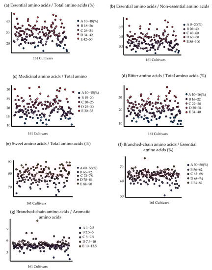 BCAAs are not only building blocks of the body’s protein but also regulators of protein, glucose and energy metabolism, and brain function [23]. It could be observed from Figure 1 that all cultivars met the requirement of BC/E ≥ 40%, and even three cultivars of BC/E reached 70%, i.e., ‘Puyangxiaozao’ (76.17), ‘Qufuhoutouzao’ (70.66), and ‘Linzedazao’ (70.13). BC/A is associated with hypertension, and it not only could predict future cardiac events in patients with heart failure but may also influence insulin resistance during pubertal development in girls [24,25,26]. It can be seen from Figure 1 that 157 cultivars reached the BC/A standard. Based on the results, it can be seen that, almost all jujube cultivars met the ideal essential amino acid standard of the human body, and had high nutritional value.