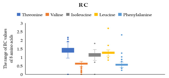 According to the WHO/FAO scoring model of essential amino acids, RC (the proportionality coefficient of amino acids) = one means the proportion of essential amino acids in food is consistent with the human essential amino acid pattern spectrum. R < one is relatively insufficient, and the amino acid with the lowest content is regarded as the first limiting amino acid. Figure 2 presents that the RC values of valine and isoleucine were close to one, indicating that the contents of these two amino acids in jujube fruit were consistent with the requirements of the human body. We determined the content of the eight primary amino acids in 161 cultivars of jujube fruits, and the results indicated that the highest RC was threonine, near one and a half, showing that the content of threonine was excessive. On the contrary, leucine and phenylalanine were less than one. In comparison, phenylalanine was the first limiting amino acid with an RC of 0–0.767.