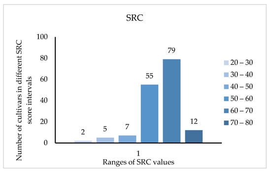 Modern research shows that amino acid deficiency affects the nutritional value, so the significance of the SRC (the score of amino acid ratio coefficient) is that if the amino acid composition of the food matches that of the model, the closer the value is to 100, the higher the nutritional value. Figure 3 shows that the SRC value of 134 cultivars was between 50 and 70, accounting for 83.2% of the cultivars tested, and only 12 cultivars had SRC values more than 70%. Among them, the five cultivars with the highest score were ‘Zhongyangtuanzao’ (73.889), ‘Zaoqiangmalianxiaozao’ (72.243), ‘Chaoyangmeixinzao’ (72.181), ‘Leng3’ (71.433) and ‘Hanguowudeng’ (71.318).