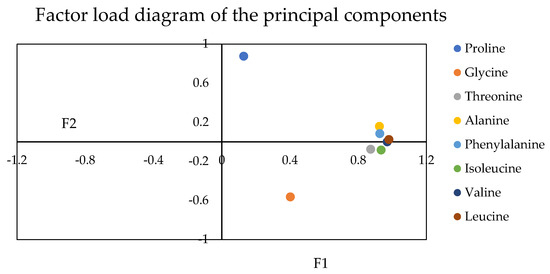 The factor load value reflects the influence of the original variable on the factor. First, positive and negative represent different directions of change. The larger the absolute value of load value, the more significant the influence of amino acids on the principal component. The amino acid content is also high when the principal component is significant. The positive sign indicates a positive effect on the principal component. Conversely, a negative sign indicates a negative effect. According to the principal component analysis, the load coefficients of eight amino acids, threonine, alanine, valine, isoleucine, leucine, and phenylalanine, were highly similar and had a significant contribution to PC 2, ranging from 0.873 to 0.979. On the contrary, proline (0.129) and glycine (0.402) were relatively dispersed. However, proline had an enormous contribution to PC 1 (0.877). On the contrary, glycine had a significant negative correlation with PC 1 (−0.562). The contribution of other amino acids to PC 1 was between −0.081 and 0.16, which was consistent with the Figure 5. Principal component analysis can use load factor information for weight calculation, therefore, this experiment calculated the weight values of 8 amino acids. See Table 3.