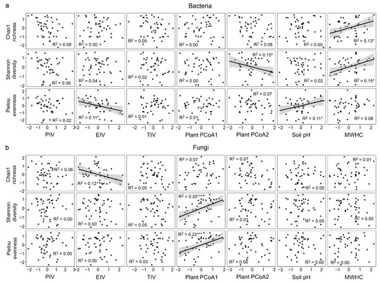 Soil bacterial and fungal alpha diversity were significantly associated with plant PCoA2 and PCoA1, respectively (Figure 2, Tables S7 and S8). Bacterial diversity was positively correlated with soil MWHC and pH (Figure 2a and Table S7). Fungal alpha diversity was negatively correlated with evergreen species dominance (EIV) but positively correlated with plant PCoA2 axis (Figure 2b). There were no significant correlations between fungal diversity and soil physicochemical properties (Figure 2b and Table S8). In addition, we found a negative relationship between plant PCoA2 and soil pH, and a negative relationship between pine dominance (PIV) and MWHC (Figure S1, Tables S9 and S10). There was no significant correlation between soil microbial diversity and PIV or between soil microbial diversity and overall tree dominance (TIV) (Figure S1, Tables S7 and S8).