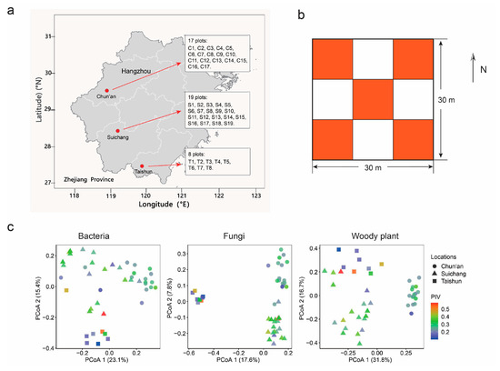 The location, sampling design, and ordination of the bacteria, fungi, and woody plant by principal coordinate analysis (PCoA) at plot level. (a) The locations of the 44 study plots in Zhejiang province, China. (b) Five, 10 m × 10 m quadrats (red color) were investigated at each plot. (c) Both soil microbiomes and woody plants are separable by three locations. PCoA was based on the Bray–Curtis distance matrices. Samples are shaped according to site locations and colored according to the importance value of Masson pine (PIV).