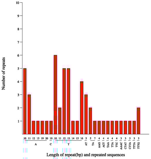 In total, 57 cpSSR motifs (including three complex SSR types) were detected in the chloroplast genome of P. angulata, most of which were single-base repetitions dominated by A and T (Table 1 and Table 2). Information about the 57 SSR motifs is shown in Table S1. Among all detected SSR loci, mononucleotides were the most abundant, with 39 loci (68.24% of the total). This was followed by tetranucleotides, with seven loci (12.28% of the total), dinucleotides, with six loci (10.53% of the total), and trinucleotides, with five loci (8.77% of the total) (Table 1). Of the mononucleotide motifs, T (24 of 39, 61.54%) was the most abundant, followed by A (14 out of 39, 35.90%). The C motif was the least frequently observed (one of 39, 0.26%) mononucleotide. The dinucleotide motifs were mainly AT and TA, each accounting for 50%, respectively. Trinucleotide motifs included AAG, ACT, TAA, TTA, and TTC, accounting for 20% each, respectively. Of the tetranucleotide motifs, TTTA (28.57%) and TTTG (28.57%) were the most abundant, followed by AAAC (14.29%), CTAT (14.29%), and CTTA (14.29%) (Table 2 and Figure 1). The average lengths (bp) of the mononucleotide, dinucleotide, trinucleotide, and tetranucleotide cpSSRs were 12.04, 10.67, 11.6 and 12, respectively (Table S1). Additionally, 39 SSR motifs (68.42%) had repeat numbers greater than or equal to 10 (Table 2 and Figure 1).