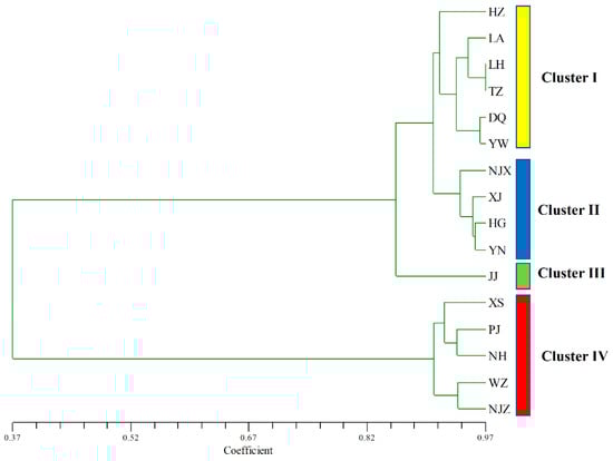 The UPGMA dendrogram of P. angulata populations was constructed on the basis of Nei’s genetic distance, which is an accurate reflection of the genetic relationships among populations. The UPGMA tree showed that the 16 populations could be divided into four major clusters (Clusters I, II, III, and IV) (Figure 2). Cluster I contained six populations, namely, HZ, LA, LH, TZ, DQ, and YW. Cluster II included four populations, namely, NJX, XJ, HG, and YN, while population JJ formed a separate cluster (Cluster III). The XS, PJ, NH, WZ, and NJZ populations were separated from the others and collectively grouped into Cluster IV.