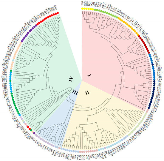 Figure 3. Neighbor-joining (NJ) phylogenetic tree of 203 individuals from 16 P. angulata populations. All tested samples were grouped into four clusters: I, II, III and IV.