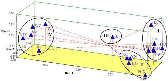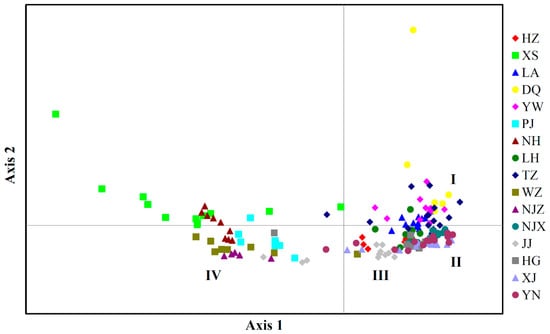 Figure 5. Principal coordinate analysis (PCoA) of 16 populations of P. angulata based on NTSYS analysis. All tested samples were grouped into four clusters: I, II, III and IV.