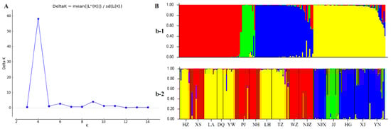 Figure 6. Population genetic structure. (A) Estimation of the best subpopulation numbers using delta K values for K ranging from 2 to 15. (B) Genetic structural plot of 16 P. angulata populations based on structure analysis. (b-1) K = 4, sorted by Q via STRUCTURE. (b-2) K = 4, samples displayed in order of P. angulata populations.