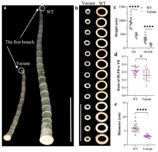 Morphology of P. edulis f. exaurita (Variant) and P. edulis (WT Moso). (a) Morphology of 2-year-old culms (parts under the first branch of the culm) of WT Moso and variant plants. The positions of the first branch at the culm are marked with white circles. The white line represents 100 cm. (b) Radial morphology of internodes under the first branch of WT Moso and variant plants. The white line represents 30 cm. (c) Total height (TH) and height under the first branch (HUFB) of WT Moso and variant plants. (d) Ratio of HUFB to TH of WT Moso and variant plants. (e) Diameter at breast height of WT Moso and variant plants. * p < 0.05, **** p < 0.0001.
