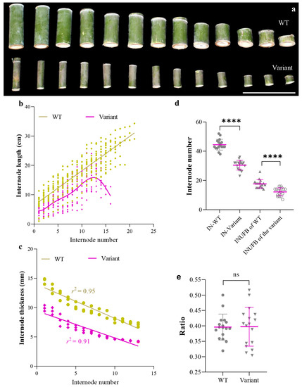In order to find out the cause of the dwarf phenotype of the variant, the number of internodes in the entire culm of the variant and WT Moso was counted. The length of every internode under the first branch of the variant and of WT Moso was also counted. The mean value of the internode length of the variant was significantly smaller and was 56.8% of the internode length of WT Moso (Figure 2a,b). Internode length under the first branch increased with increasing internode number at WT Moso. In contrast, in the variant, the internode length first increased to the 13th internode and then decreased (Figure 2b). Like internode length, the mean value of internode thickness of the variant was also significantly less than that of WT Moso. The trend of internode thickness with an increase in internode number was similar for the variant and WT Moso. All decreased as the number of internodes increased (from bottom to top) (Figure 2c). In addition, the number of internodes in the culm of the variant was also significantly lower than that of WT (Figure 2d). The number of internodes in the culm of WT Moso ranged from 38 to 52, while the number of internodes in the variant ranged from 26 to 36 (Figure 2d). The number of internodes under the first branch was also counted (Figure 2d). The number of internodes under the first branch of the variant ranged from 7 to 16, which is also much less than that of WT Moso (14~21) (Figure 2d). However, the ratio between the number of internodes under the first branch and the number of internodes in the whole culm was similar for the variant and WT Moso (Figure 2e).