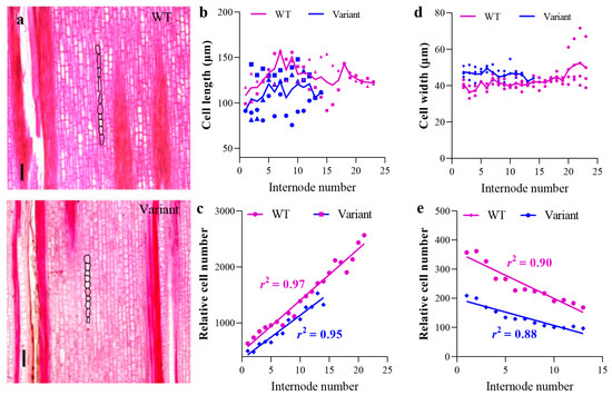 To further compare the internodes of the variant and WT, an anatomical analysis of each internode under the first branch was performed. Three 2-year-old culms of the variant and WT Moso were selected. The lengths and widths of more than 30,000 cells were measured (Figure 3a). The cell length of the internodes in the variant was significantly shorter than that of WT Moso (Figure 3b). The number of cells in the longitudinal direction of the internodes of the WT Moso was significantly larger than that of the variant (Figure 3c). The law that the relative cell number in the longitudinal direction changed with increasing internode number (from bottom to top) was similar for the variant and the WT Moso (Figure 3c). In addition, the cell width of the internodes of the WT Moso was significantly smaller and was 93% that of the variant (Figure 3d). In the radial direction, the number of cells in the internodes of the WT Moso was significantly greater than that of the variant (Figure 3e). However, the regularity with which the relative number of cells in the radial direction changed with increasing internode number was similar in the variant and WT Moso (from bottom to top), both of which follow the linearly increasing model (Figure 3e).