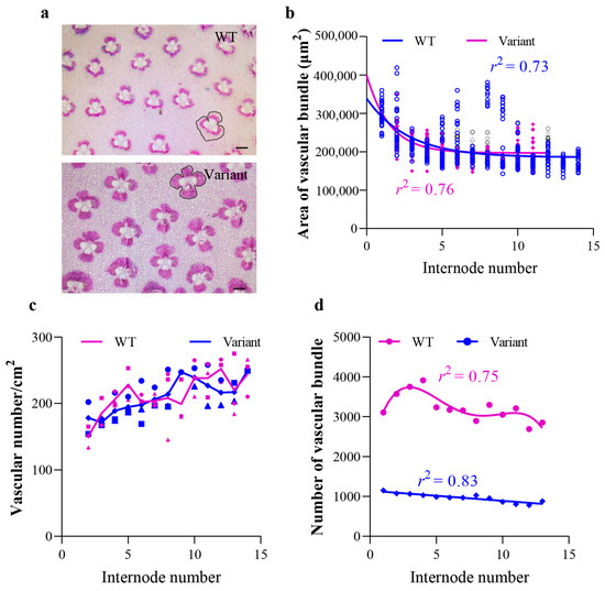 In addition, cross-sections of each internode below the first branching were utilized to compare the vascular bundles of the variant and WT Moso (Figure 4). The vascular bundles in the culm of the variant were symmetrical, making up a classic open vascular bundle similar to that of the WT Moso (Figure 4a). It was found that the size of vascular bundles was similar in the variant and WT Moso (Figure 4b). The regularity with which the size of the vascular bundles changes with increasing internode number (from bottom to top) was also similar in the variant and WT Moso (Figure 4b). When counting and comparing the density of vascular bundles, no significant difference was observed between the variant and WT Moso (Figure 4c). In contrast, the number of vascular bundles was significantly lower in the variant than in WT (Figure 4d).