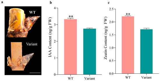 Auxin and zeatin content of S2-stage buds of P. edulis f. exaurita (variant) and P. edulis (WT Moso). (a) S2-stage buds of WT Moso and the variant plants. (b) IAA content of S2 buds of WT Moso and the variant. (c) Zeatin content of S2 buds of WT Moso and the variant. ** p < 0.01. White line in (a) represents 1 cm.
