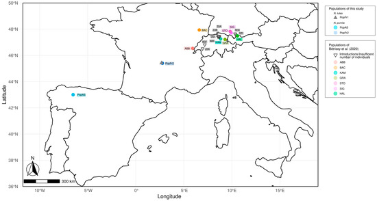 Geographic location of the relict isolated populations of Nuphar pumila and N. lutea used for this study. The populations sampled for this study are represented as blue circles (N. pumila) and grey triangles (N. lutea). The populations of N. pumila from Bétrisey et al. [9] used in this study are shown as colored circles (population samples used for the population diversity analyses) and inverted triangles (population samples not used for the population diversity analyses).
