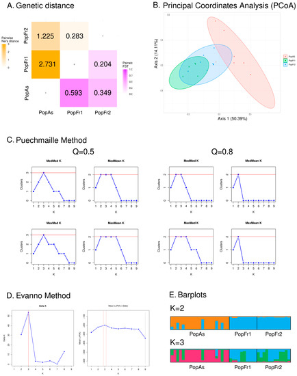 Regarding the STRUCTURE analyses, the Puechmaille less restrictive analysis (Q = 0.5) and the Evanno methods indicated that the most adequate K value was K = 3, while the more restrictive Puechmaille method analysis (Q = 0.8) indicated that the most adequate K values were K = 2 and K = 3, as the median-based estimators (MedMeaK and MedMedK) indicated this interval (see Figure 2C,D). Thus, the most adequate K values ranged from two to three. The barplot representation of both values revealed that, in both cases, the north Iberian isolated N. pumila population was dominated by an exclusive cluster, while the French populations were both dominated by the same majority cluster (see Figure 2E).
