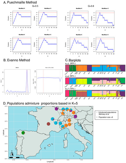 (A) Graphical representation of the four estimators (MedMeaK, MaxMeaK, MedMedK and MaxMedK) using the Puechmaille method to determine the most adequate K value. The analyses based on the two values set for the mean membership coefficient of a cluster (Q) are represented. (B) Graphical representation of delta K analyses used in the Evanno method. (C) Barplots of the STRUCTURE results of the two most adequate K values as determined by the Evanno and Puechmaille methods. (D) Graphical representation of the admixture populations based on the K = 5 STRUCTURE analysis results [9].
