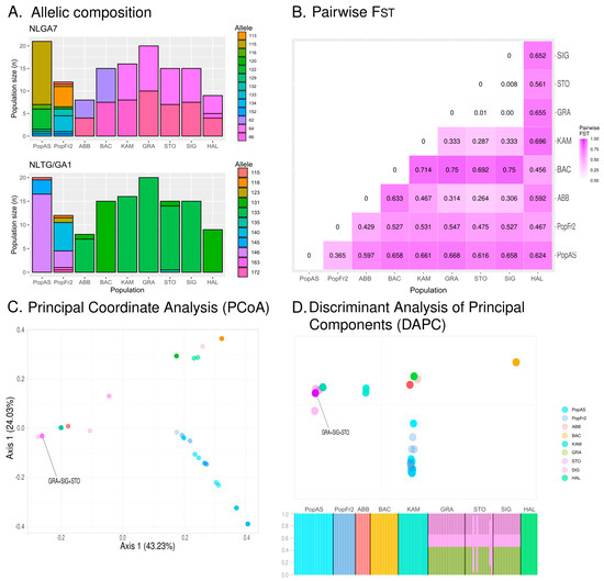 The sequences were visualized using GeneMarker® [39] and coded numerically according to the number of repetitions. Once the data matrix was generated, several parameters focusing on genetic diversity and structure were estimated using GeneALEx 6.5 [40] to assess the genetic diversity within and between populations. The genetic structure of these 3 populations (PopAS, PopFr1 and PopFr2) was inferred via the estimation of Wright’s F-statistics and other population parameters [41,42,43]. Thus, the number of observed alleles per locus (NA), the effective number of alleles per locus (NE), the expected heterozygosity (HE) and the observed heterozygosity (HO) were estimated for each of the three different populations. Additionally, the Shannon Information Index (I) (Shannon 1948), which measures variation among populations, and the standardized coefficient of genetic differentiation (G″ST) [44,45] using 9999 permutations were estimated as measures of genetic structure and differentiation.