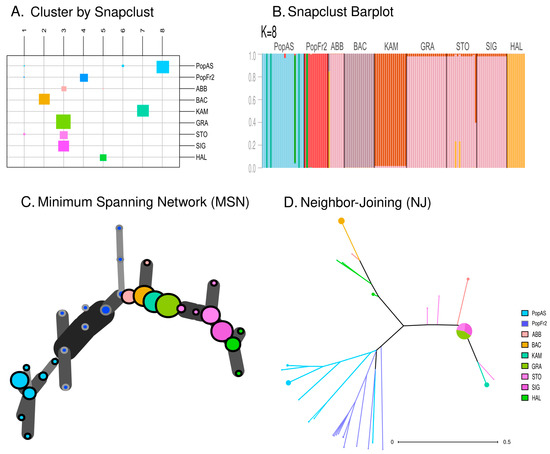 (A) Assignment of the individuals of each population to each of the clusters inferred using the snapclust analysis (K = 8). The size of the squares corresponds to the number of individuals attributed to each inferred cluster. (B) Barplot representing the membership probability of each individual belonging to each cluster in the snapclust analysis (K = 8). (C) Minimum Spanning Network (MSN) dendrogram based on Bruvo distance. (D) Neighbor-Joining network based on a dissimilarity matrix.