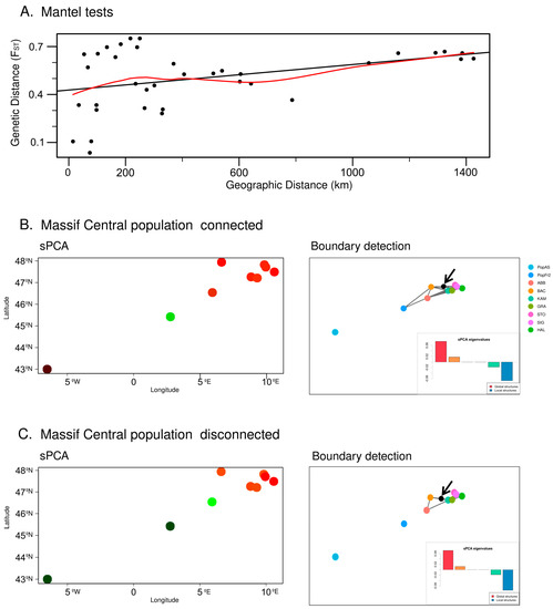 (A) Mantel test based on the geographical distance and the genetic distance estimated by the FST. (B) Results of the spatial PCA (sPCA) and the boundary detection using the Monmonier algorithm, based on a connection network in which the Massif Central N. pumila population (PopFr2) is connected to the Alps populations. The detected boundary is represented by a black dot and is further indicated by a black arrow; on the other hand, the colors of the dots represent genetic similarity (more similar colors represent higher genetic similarity). (C) Results of the spatial PCA (sPCA) and boundary detection using the Monmonier algorithm, based on a connection network in which both the Massif Central N. pumila population (PopFr2) and the Iberian N. pumila population are disconnected from the Alps populations. The detected boundary is represented by a black dot and is further indicated by a black arrow; the colors of the dots represent genetic similarity (more similar colors represent higher genetic similarity).