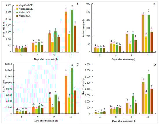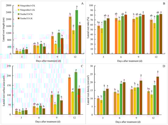 The length and surface area of lateral roots under LK treatment were also reduced compared with CK (Figure 3). However, the lateral root and surface area of Xushu 32 under LK treatment were significantly higher than those of Ningzishu 1 from day 6 to day 12. Until day 12 of LK treatment, the lateral root length and surface area of Xushu 32 were significantly higher than those of Ningzishu 1 by 21.39% and 13.47%, respectively. Nevertheless, compared with the CK treatment, LK treatment increased the lateral root ratio and density of Xushu 32, and the lateral root density significantly increased by 24.5% and 29.0% on the 9th and 12th day, respectively. In contrast, the ratio and density of lateral roots of Ningzishu 1 decreased under LK treatment (except on day 9); although these decreases were not significant compared with CK, they were significantly lower than those of Xushu 32.