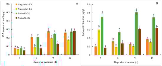 The IAA content in Xushu 32 leaves continuously increased with the prolongation of LK treatment time, and in Ningzishu 1 leaves, the IAA content first increased but then decreased (Figure 4). The IAA contents in the leaves of Xushu 32 were lower than those in Ningzishu1 from day 3 to day 9 under LK, but, at 12 days, the IAA contents in Xushu 32 were significantly higher (57.86%) than those in Ningzishu 1. Under LK treatment, the IAA content in the roots of Xushu 32 roots also increased, but it first decreased and then increased in Ningzishu 1 roots, and was significantly lower than that of Xushu 32 at the 6th, 9th, and 12th days (by 28.5%, 65.6% and 106%, respectively).