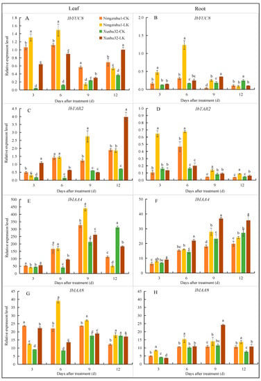 The relative expressions of IbYUC8 and IbTAR2 in the leaves of Xushu 32 treated with LK were significantly higher than those of the CK (except IbTAR2 at day 9), and 2.7 times and 5.5 times higher than those of the CK at day 12, respectively (Figure 5A–D). In contrast, the relative expression of IbYUC8 in the leaves of Ningzishu 1 was significantly increased on days 3 and 6, but decreased significantly after day 9. Additionally, the relative expression of IbTAR2 in the leaves of Ningzishu 1 was significantly higher than that of the CK only at day 9, but had no significant difference to CK at day 12. During the first nine days of LK treatment, the relative expression of IbYUC8 in the roots of the two varieties increased compared with the CK, but the increase in Ningzishu 1 was higher and the difference was significant. However, it showed no significant difference (Ningzishu 1) or even decreased (Xushu 32) on day 12. Unlike in the leaves, the relative expression of IbTAR2 in the roots of Ningzishu 1 under LK treatment was significantly higher than CK, while that in Xushu 32 was significantly higher than CK but only on the 12th day. These results indicated that the IAA synthesis in the leaves of Xushu 32 was higher than in Ningzishu 1, while the IAA synthesis in the roots was lower than in Ningzishu 1.