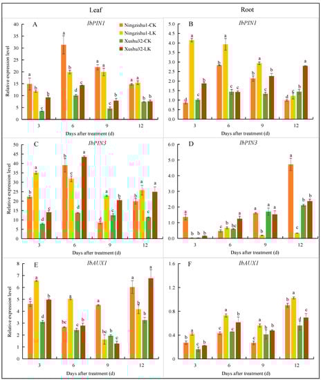 The results showed different expression patterns of IbPIN1, IbPIN3, and IbAUX1 in different locations and varieties (Figure 6). Under LK treatment, the relative expression of IbPIN1 in the leaves and roots of Xushu 32 was increased overall in the leaves and roots of Xushu 32, which was significant on days 3, 6, 9 in the leaves and 3, 9, 12 in the roots. In contrast, the relative expression of IbPIN1 in the leaves of Ningzishu 1 under LK treatment decreased significantly in the first 6 days and there was no change in the last 6 days. The relative expression level of IbPIN1 in the roots of Ningzishu 1 was significantly increased at first, but continuously decreased with the extension of the date, and was significantly lower than that of Xushu 32 on the 12th day. The relative expression of IbPIN3 was significantly increased in the leaves of Xushu 32 under LK treatment, but only significantly increased in the roots on day 6. For Ningzishu 1, the relative expression level of IbPIN3 in leaves increased significantly under LK treatment, but in roots decreased significantly except on the 6th day. Under LK treatment, the relative expression level of IbAUX1 in the leaves and roots of Xushu 32 was significantly increased (except for on the 9th day), which was also significantly increased in the roots of Ningzishu 1, but it was significantly decreased in the leaves from the 9th day.