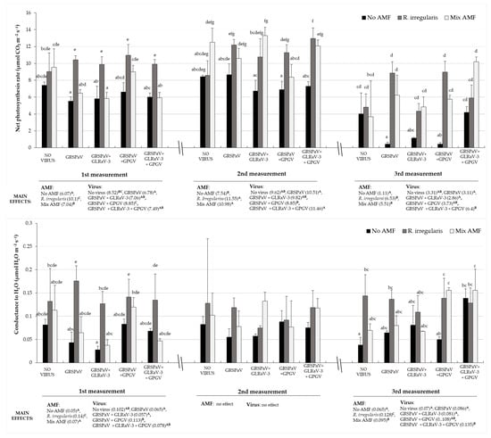 Effects of AMF inoculation on net photosynthesis rate (top) and conductance to H2O (bottom) shown in three measuring points during the growing season of grapevine infected by different combinations of GRSPaV, GLRaV3 and GPGV viruses. Measuring was done in May (1st), June (2nd) and September (3rd). Two-way ANOVA was made for each measurement with uppercase letters indicating statistically significant difference in main effects with means in brackets. Treatments with distinct lowercase letters indicate a statistically significant difference in each measurement (p < 0.05) determined by the Bonferroni post-hoc test.